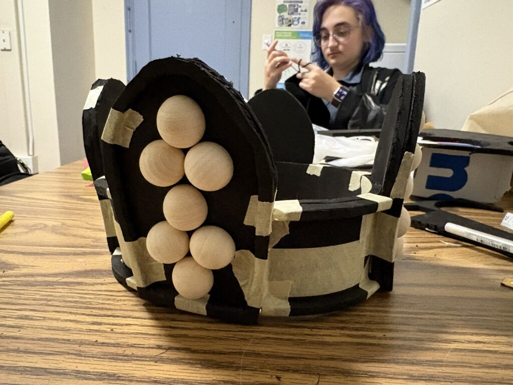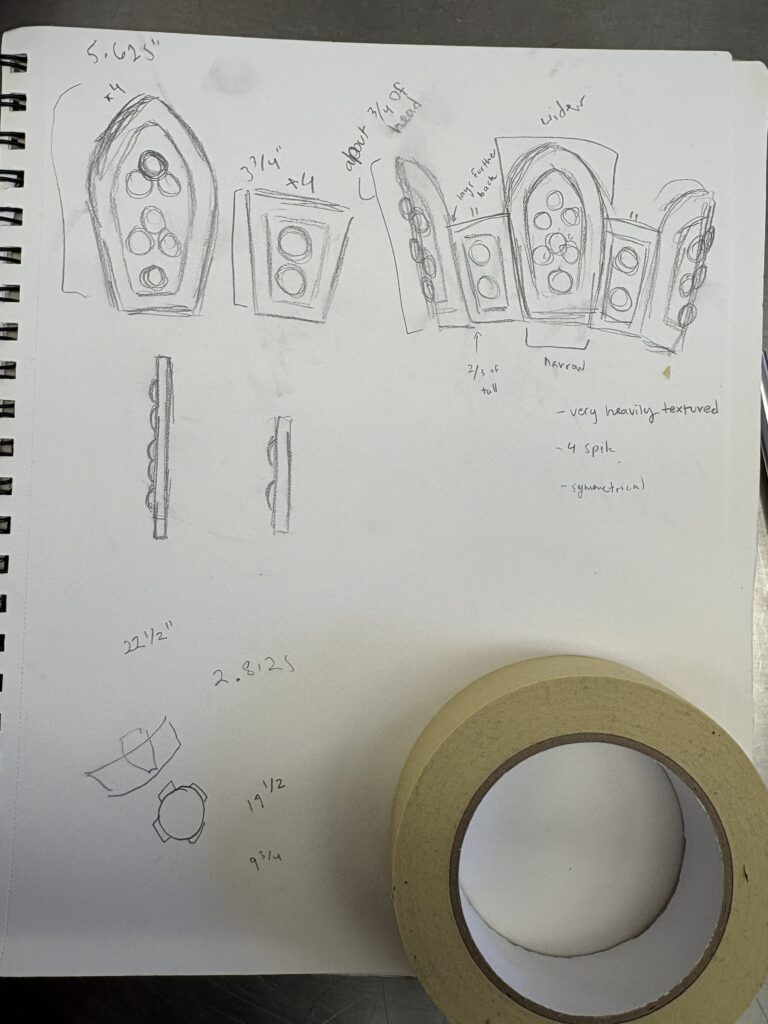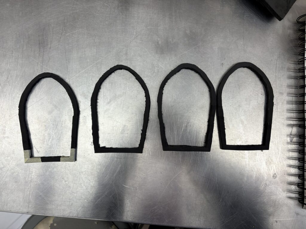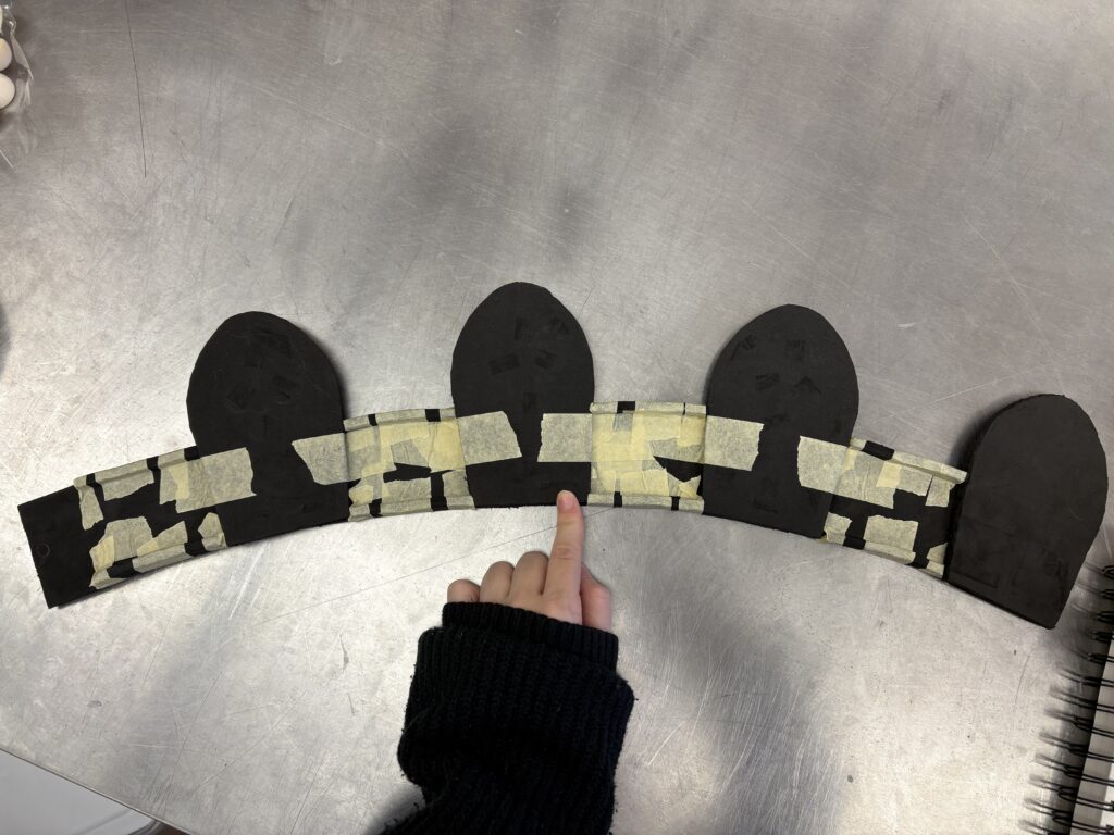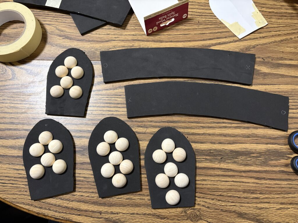 I cut out the pieces in foam and placed pieces to make sure that they fit, and taped it all together for the mock up. This is where I made my biggest mistake, and did not account for the depth of the foam, so it did not fit properly.