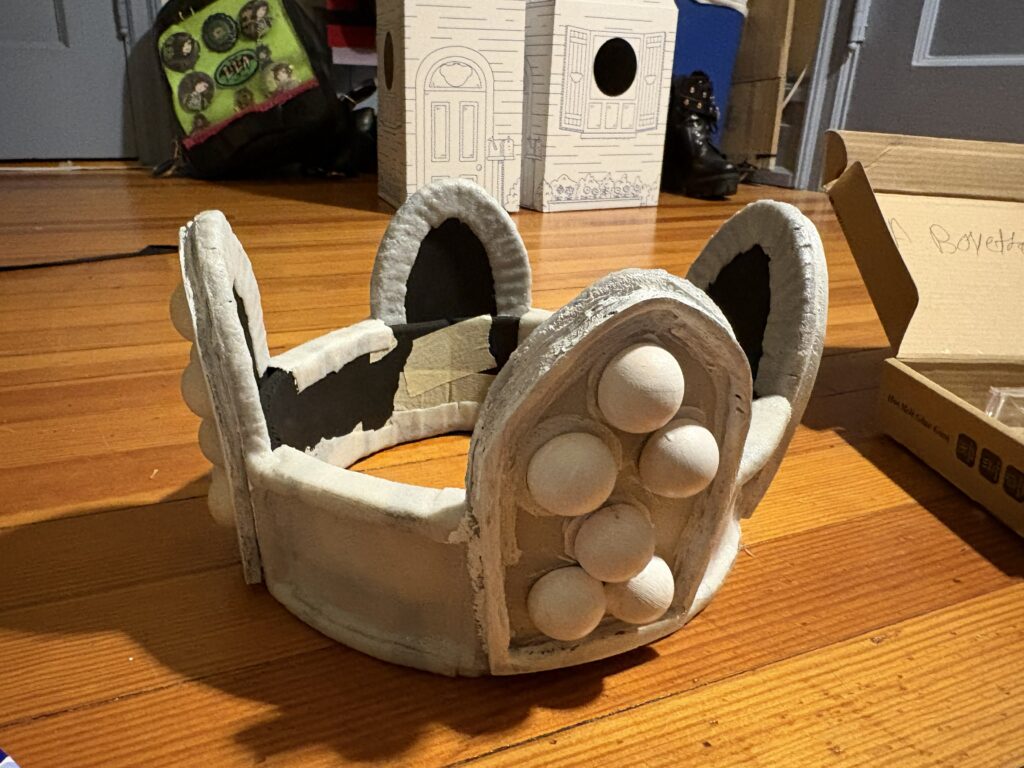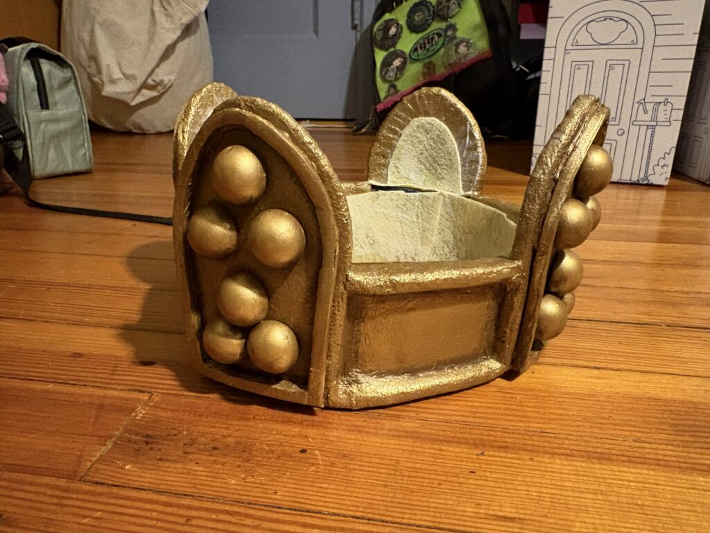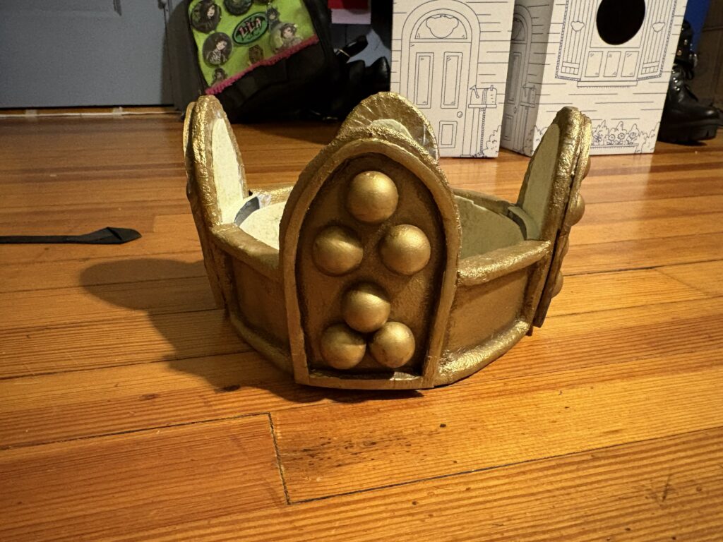 I then attached the wooden balls, painted, and put felt on the inside. I wish that I had not felted the spires, but other than that, I like how it looks. I think there is a good dimensionality to the painting, which is a large improvement from my last crown.